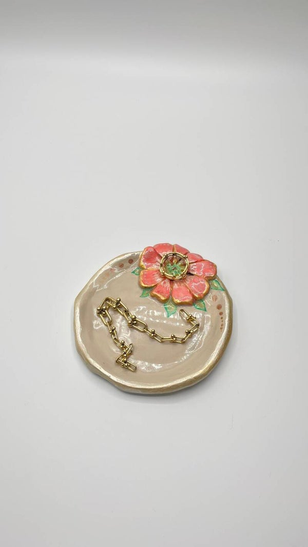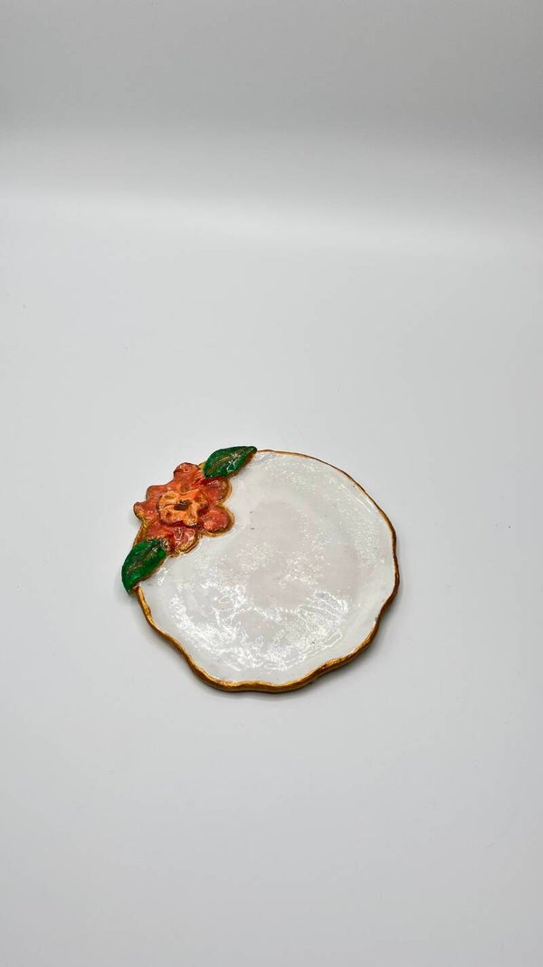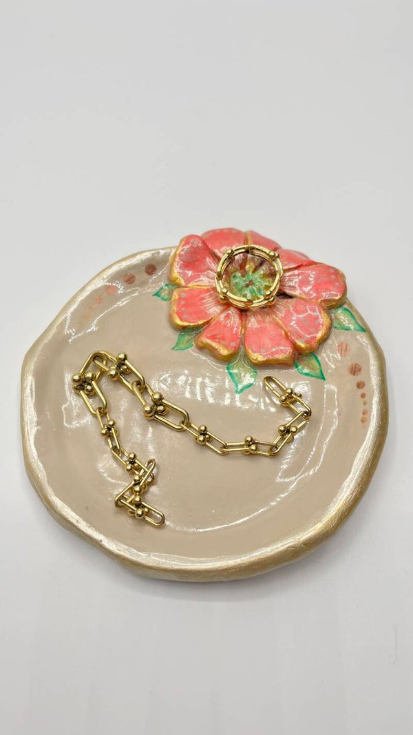 Diese handgefertigte Schmuckschale ist ein dekoratives Unikat zur stilvollen Aufbewahrung von Ringen, Ketten oder kleinen Lieblingsstücken. Die zarte Blütenapplikation verleiht der Schale einen romantischen Akzent. Handbemalt und mit einer glänzenden Resin-Versiegelung veredelt.