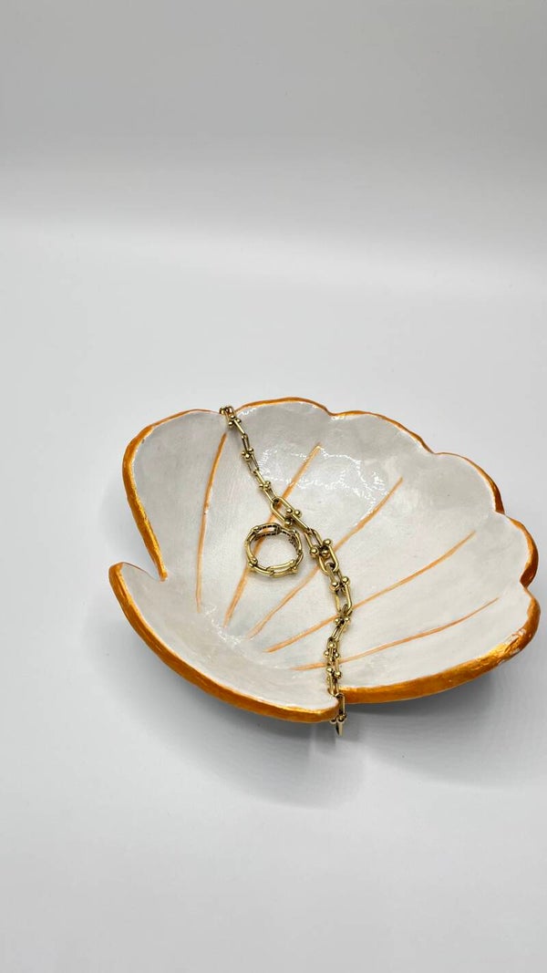 Diese handgefertigte Schmuckschale in Muschelform ist ein elegantes Deko-Highlight. Die feinen Linien und goldenen Akzente machen sie zu einem besonderen Hingucker auf Nachttisch oder Schminktisch. Glänzend mit Resin versiegelt für eine hochwertige Optik.