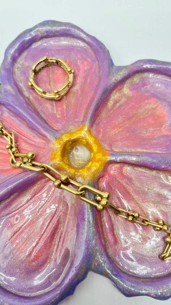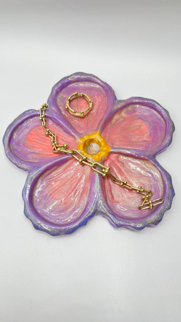 Diese liebevoll handgefertigte Schmuckschale in Blumenform ist ein echtes Unikat. Sie wird aus Air-Dry Clay gefertigt, von Hand bemalt und mit glänzendem Resin versiegelt. Perfekt zur Aufbewahrung von Ringen, Ketten oder kleinen Schätzen – dekorativ und praktisch zugleich.