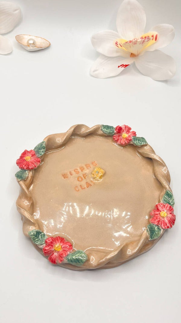 Die Schale wird aus hochwertigem Ton gefertigt, von Hand mit Acrylfarben bemalt und mehrfach mit Resin versiegelt, um eine glatte, glänzende und langlebige Oberfläche zu erzielen. Die zarten Blumendetails und Blätter verleihen ihr einen romantischen, natürlichen Charme.