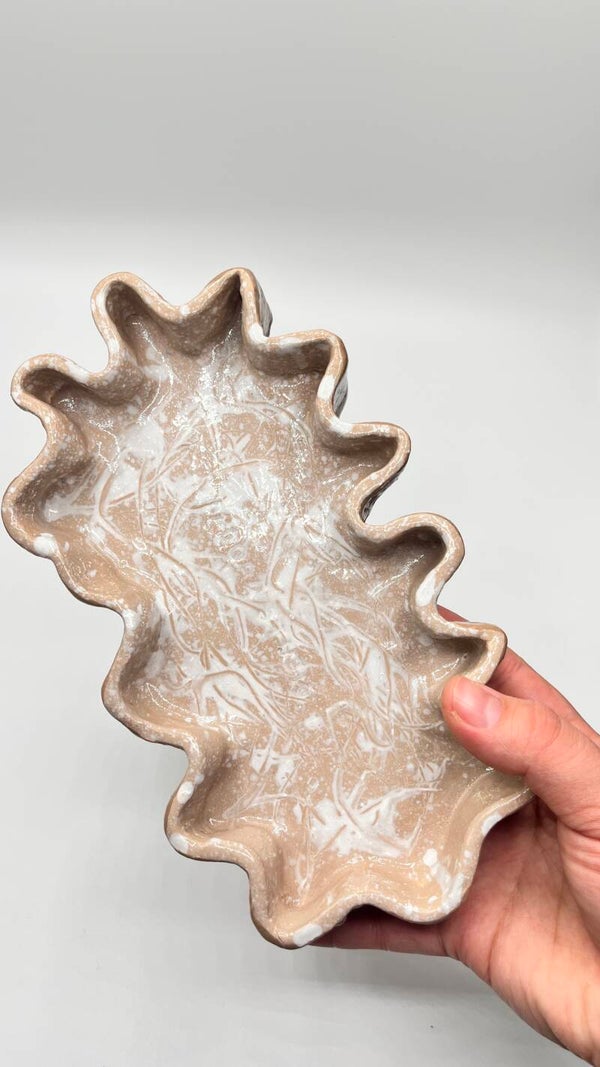 Diese einzigartige Schmuck-Trinket-Tray mit organischer Wellenform überzeugt durch ihr modernes, natürliches Design. Die sanft geschwungenen Ränder und die harmonische Braun-Beige-Farbgebung verleihen der Schale eine ruhige, elegante Ausstrahlung.
