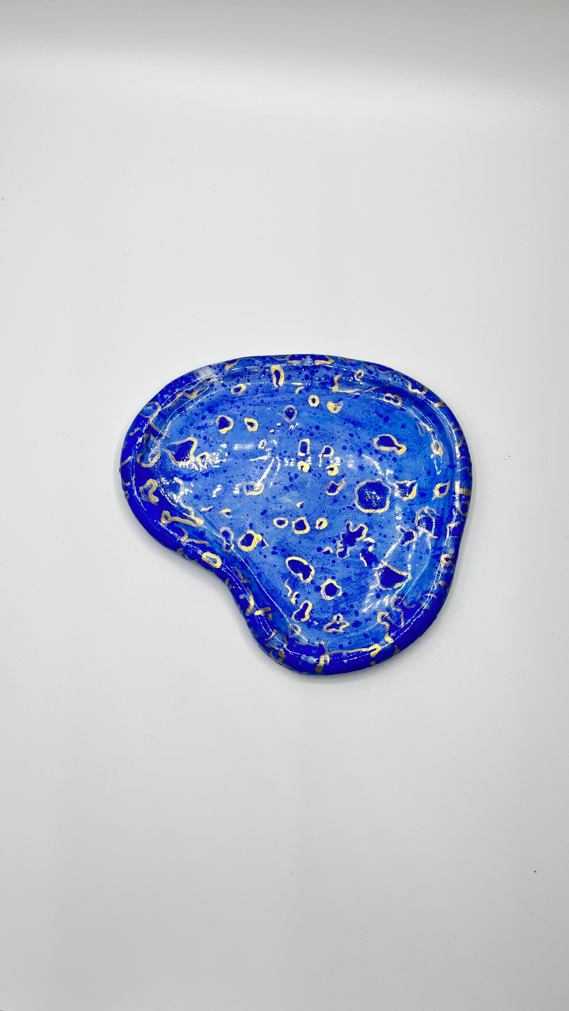 Diese ausdrucksstarke Schmuck-Trinket-Tray mit organischer Form ist ein modernes Statement-Piece für dein Zuhause. Die kräftige blaue Farbfläche wird durch feine goldene Akzente ergänzt und verleiht der Schale eine elegante, künstlerische Ausstrahlung.