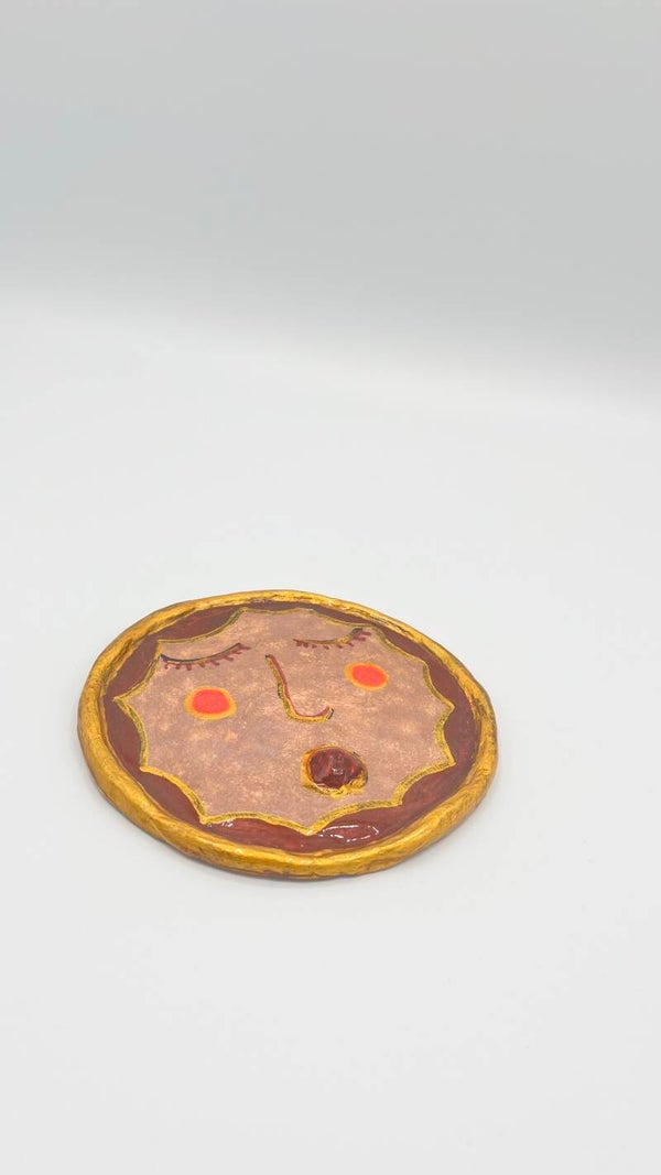 Dieser besondere Räucherstäbchenhalter aus Keramik vereint Funktionalität mit künstlerischem Ausdruck. Das handgemalte Gesichtsmotiv in warmen Braun-, Rot- und Goldtönen verleiht dem Stück eine ruhige, fast meditative Ausstrahlung.