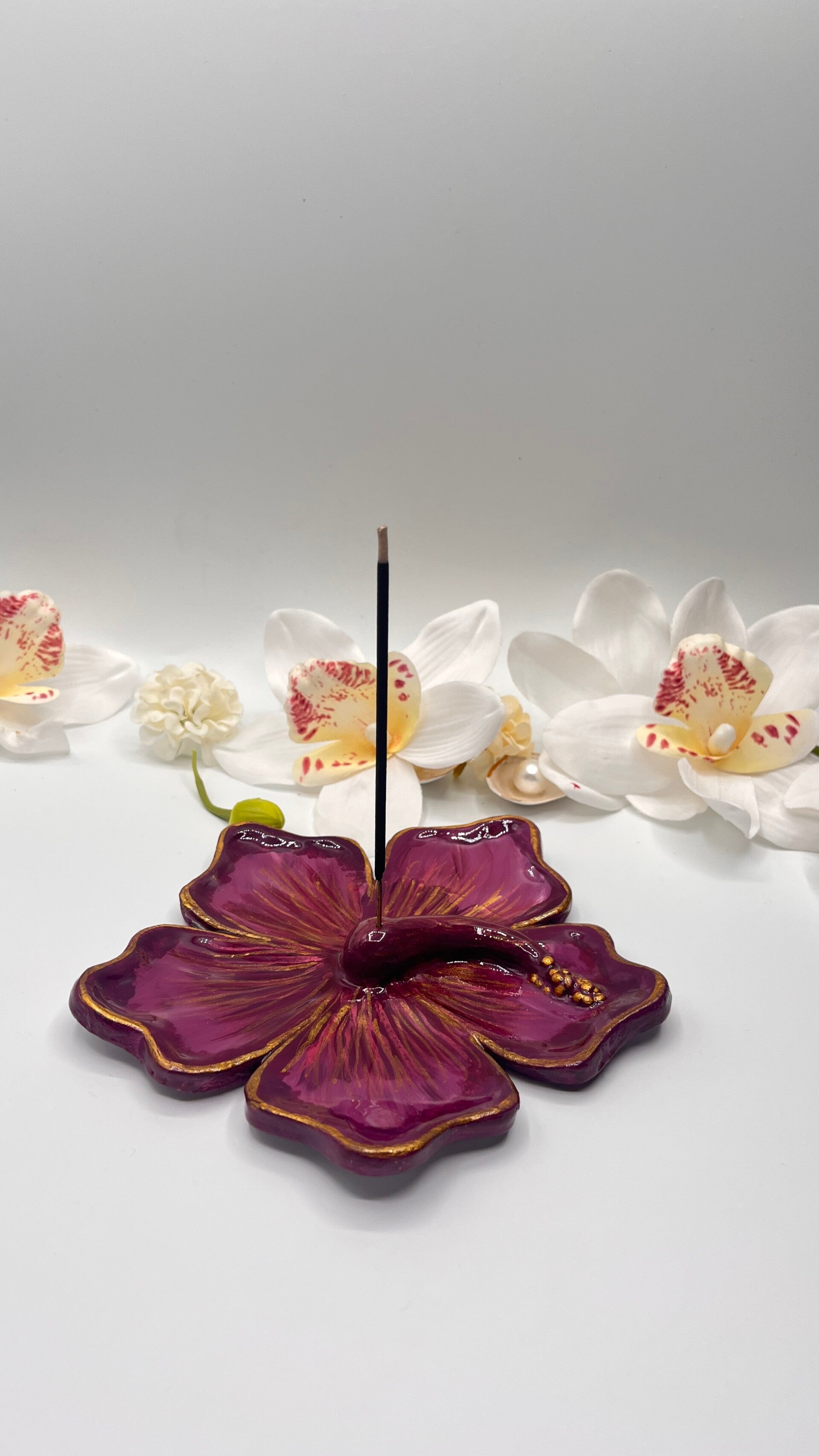 Dieser handgefertigte Räucherstäbchenhalter in Form einer Hibiskusblüte ist ein einzigartiges Deko- und Wellnessstück. Aus hochwertigem Ton gefertigt, von Hand mit Acrylfarben bemalt und mit goldenen Details veredelt. Die glänzende Resin-Beschichtung sorgt für eine edle Oberfläche.